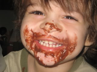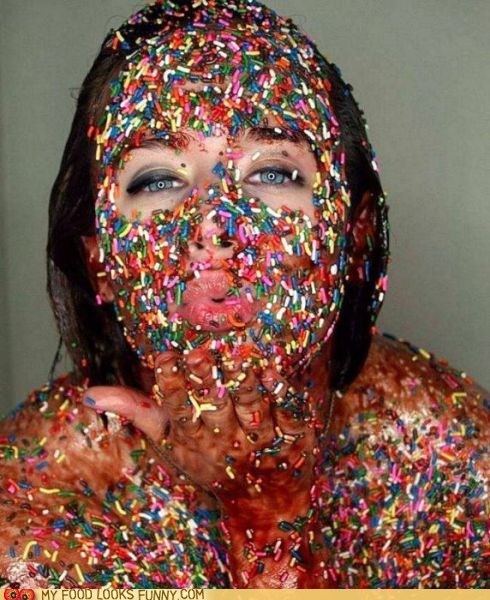 At the corner of her mouth was a little chocolate sauce and one colored sprinkle.
